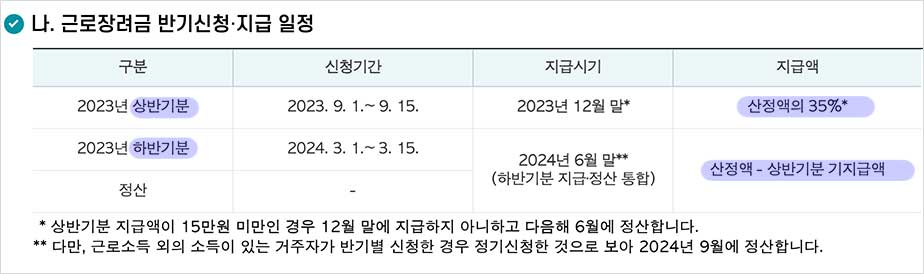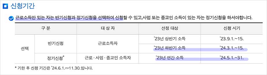 반기신청 기간은 1년에 두 번 3월과 9월입니다. 근로소득만 있는 근로자가 신청할 수 있습니다.