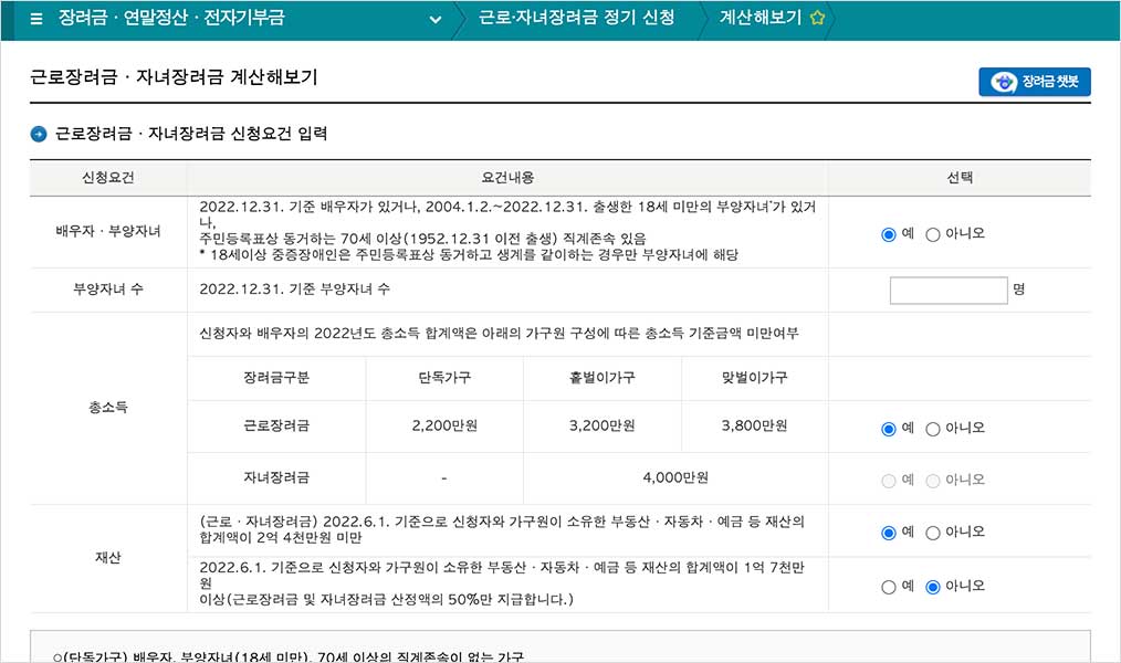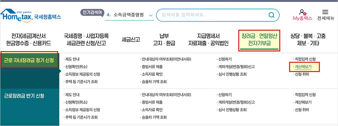 장려금·연말정산·전자기부금 → 근로·자녀장려금 정기 신청 → 계산해보기