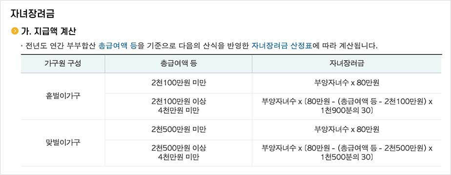 홈택스 자녀장려금 지급액 계산 안내에 따르면, 전년도 기준 연간 부부합산 총 급여액 등 기준으로 자녀장려금 산정표에 따라 계산한다고 합니다.