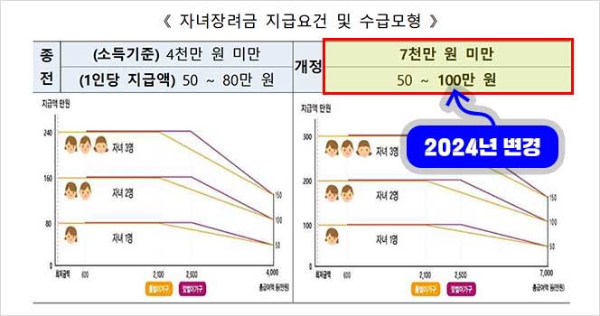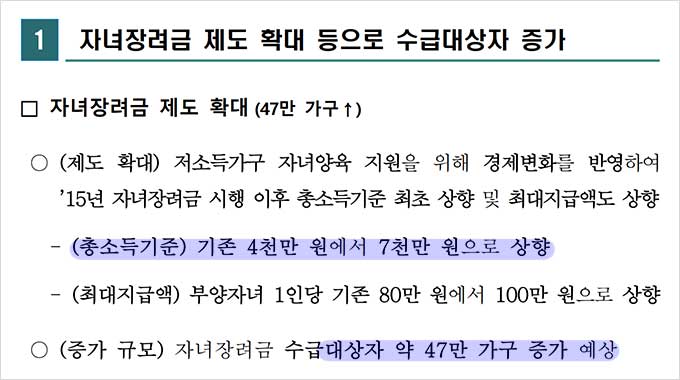총소득 기준이 4천만원에서 → 7천만원으로 확대돼서 자녀장려금 지원대상이 약 47만 가구나 증가할 것으로 예상하고 있습니다.